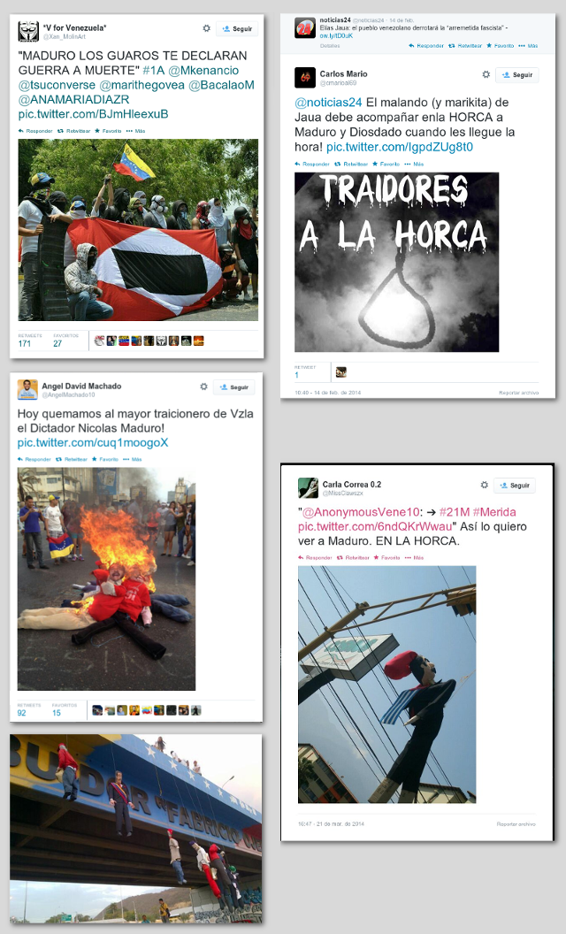 Haciendo búsquedas más profundas en Twitter, encontramos tuits con imágenes aún más perniciosas contra el presidente venezolano y sus funcionarios, algunas de ellas amenazándolos con sufrir el mismo destino que sufrieron los entonces presidentes de Libia, Muhammad Ghadaffi, o de Irak, Saddam Hussein. Las reproducimos a continuación para dejar constancia de nuestros argumentos.