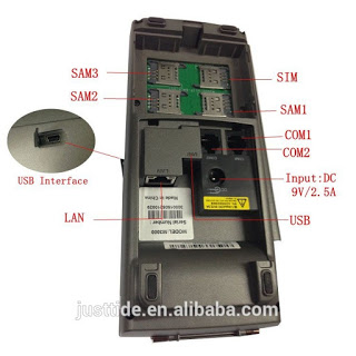 | Parte trasera (destapado) de un punto de ventas, que acepta hasta cuatro tarjetas SIM de empresas de telefonía celular |