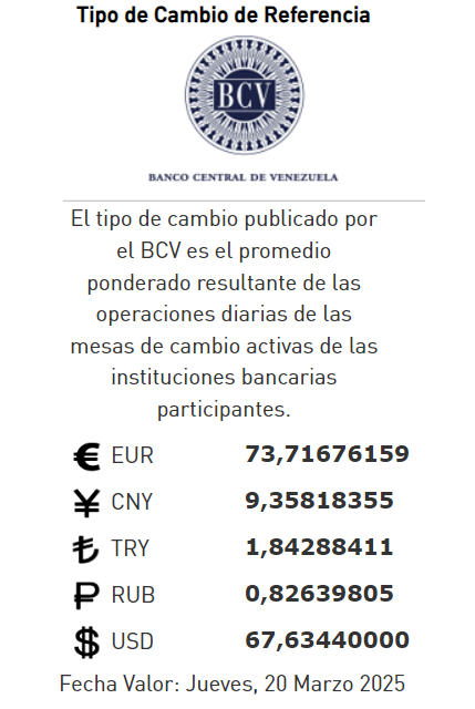 19-03-25.-El precio del dólar en el Banco Central de Venezuela (BCV) se cotizó este martes 18 de marzo 2025 en Bs.67,63 por unidad según la última actualización en su página web oficial y redes sociales.