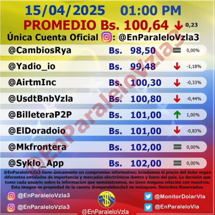 Por otro lado, el dólar paralelo en diversas plataformas en la jornada de hoy cerró en un promedio de Bs.100,64 la unidad, según Monitor-Noticias Venezuela.