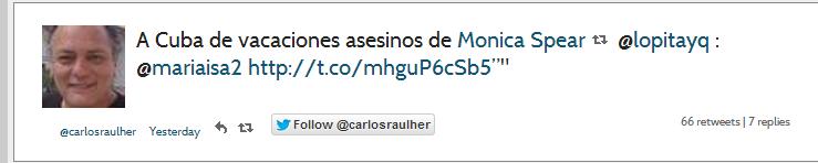 Por último, en tuiter encontramos otras reconstrucciones falsas de la realidad, como el mensaje que difundió el politólogo Carlos Raúl Hernández, sobre el destino que las autoridades venezolanas tendrían preparado para los presuntos asesinos de Mónica Spear y su compañero. Hernández afirmó que serían enviados a Cuba para rehabilitarse, tergiversando un anuncio ministerial de octubre de 2013. Este fue su mensaje de tuiter: