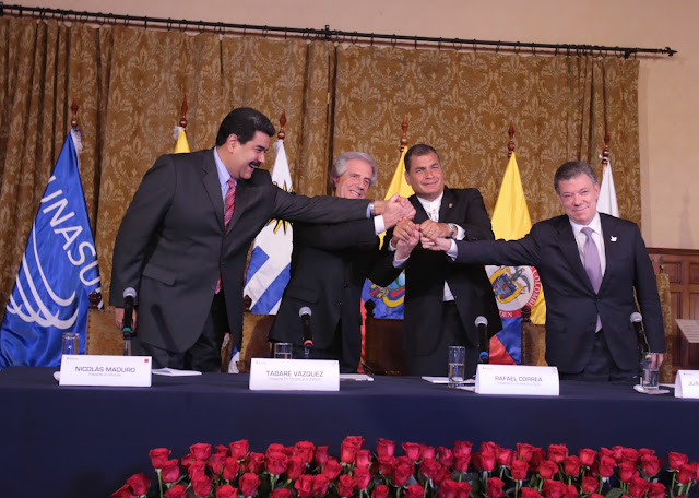 7.- Continuar trabajando con el acompañamiento de Ecuador y Uruguay.Básico. Vital. Este diálogo será sostenible -y avanzará aún con trabas y dificultades- sólo si lo acompaña la región. En ese sentido, Quito, y los instrumentos diseñados y creados por el genio de Chávez, la Unasur y la CELAC, han demostrado nuevamente la artificiosa inutilidad de la OEA, el caduco discurso intervencionista de la Unión Europea, y ha propinado una nueva derrota política al atribulado policía del mundo. En Quito,en el centro del mundo, América Latina ha anotado un gol por la paz. Más tarde, se verá si fue suficiente. Aún queda mucho partido por jugar.