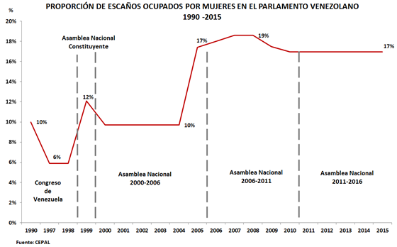 Tomando en cuenta que las elecciones al parlamento Venezolano se realizan cada 5 años, la CEPAL señala que el 17% de los escaños son ocupados actualmente por mujeres, cifra que viene incrementándose progresivamente y se espera que en los próximos comicios electorales Venezuela supere al promedio mundial para ubicarnos a la par de la región.