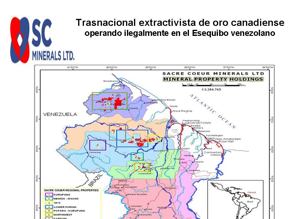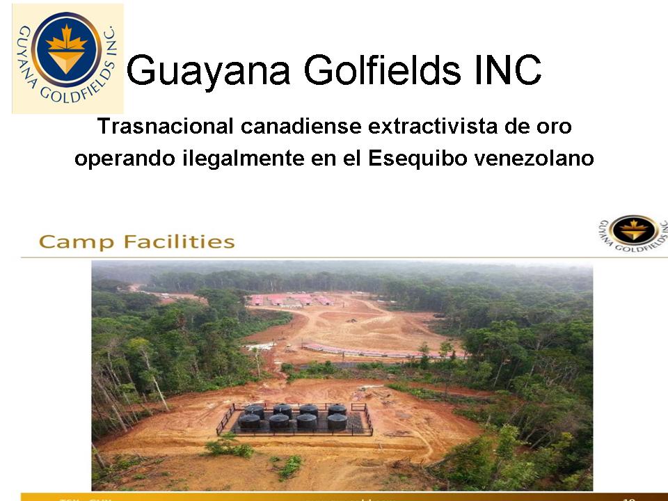 La canadiense Guyana Goldfields , Sandspring Resources LTD. y Argus Metal Corp están perpetrando una acción fuera del marco legal de las normas convencionalmente aceptadas mediante la reclamación que se mantiene de este territorio con vigencia ante Naciones Unidas que se pacto entre ambos Estados en el Acuerdo de Ginebra firmado en 1966. Cabe resaltar que dicho diferendo aun sin resolución definitiva no menoscaba la soberanía que Venezuela tiene sobre su territorio. Así mismo, hacemos de su conocimiento que las prenombradas empresas son agentes activos coparticipes del desplazamiento forzado de las comunidades aborígenes que habitan milenariamente en estas zonas verdes donde se están realizando en este momento las extendidas y destructivas operaciones de minería a cielo abierto.