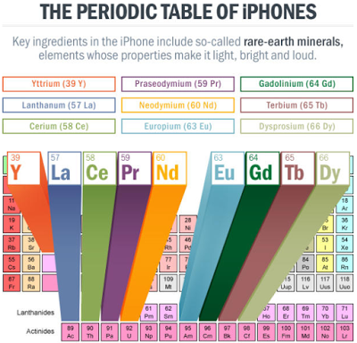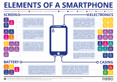 Estas infografías, tomadas de Scientific American y CompoundChem, muestran algunos de estos minerales o "elementos raros", que son requeridos para cada teléfono y artefacto electrónico que queramos poseer. Puede hacerles click para verlas más grandes.
