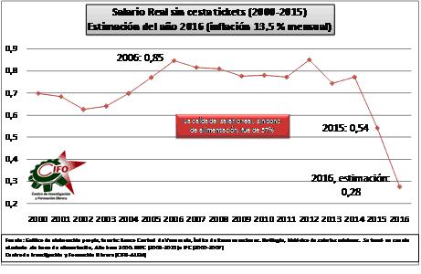 En el gráfico 4 observamos la medición del salario a través de dólares no oficiales, los que comúnmente se transan en el mercado y sirven de referencia para la fijación de precios de la mayoría de mercancías. En la figura a continuación notamos que el máximo nivel salarial se obtuvo en el año 2001, cuando el salario mínimo rondaba los 400 dólares mensuales, en esa época era quizás el salario más alto de América Latina. A partir de 2003 se aplica un severo control de cambio, lo cual no es óbice para ver el salario merodear los 315 dólares (en 2003 había caído a $ 250), ya lejos del año 2001, pero bastante arriba en comparación de muchos salarios en América Latina. El último año de cierto nivel de estabilidad en el salario fue el 2011, donde el precio del petróleo mostró su último gran impulso. En ese año el salario ya había caído a los 250 dólares. De ahí en adelante la caída del salario explica parte de la tenaz situación que la clase obrera sufre en la actualidad. Con apenas 61 dólares el salario del 2016 es 87,6 % más bajo que el salario del año 2011, y es 92 % más bajo que el salario del año 2001, en el cual el chavismo no había implantado el control de cambio actual y no había problema alguno para cambiar los bolívares por las divisas que se quisieran.