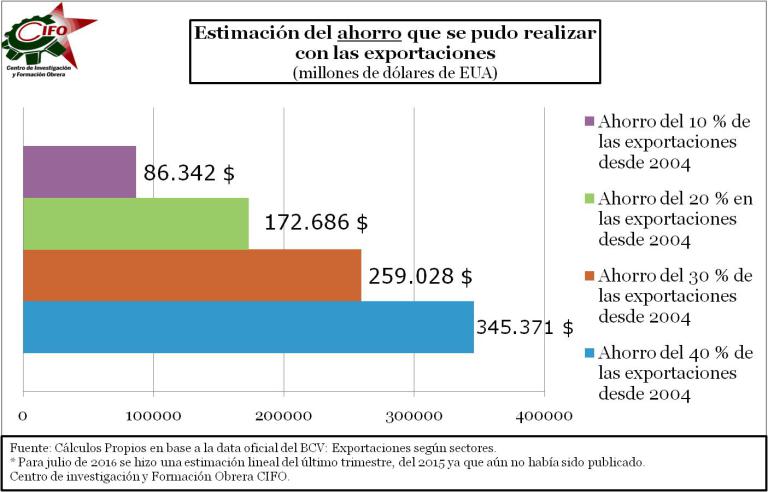 En el gráfico anterior podemos ver que con un ahorro de apenas 20 % de las exportaciones, que repetimos, se multiplicaron por casi 4 veces en el período 2003 a 2012, se pudo haber ahorrado más de 170 mil millones de dólares, lo equivale a más de 15 veces la totalidad de las exiguas reservas internacionales (2016) del país. Esta fabulosa cantidad es igual a 12 años de importaciones, tomando en cuenta las importaciones del año 2003 (el primer año del control de cambio). Si consideramos que el incremento neto de las exportaciones llegó a ser de 257 %, es plausible imaginar que se pudo ahorrar el 40 % de las exportaciones con un poco de disciplina. De haber hecho esto, el país hubiera podido acumular más de 345 mil millones de dólares. Con ello tendría el equivalente a más de 30 veces las minúsculas Reservas Internacionales de hoy en día y a la vez tuviera una cifra de ahorro equivalente a 24 años de importación (a niveles del año 2003), cuando el control de cambio daba sus pinitos. Incluso ahorrando un 10 % de las hercúleas exportaciones se pudo obtener más 6 veces las reservas internaciones de nuestra actualidad y más de cinco años de importaciones (2003).