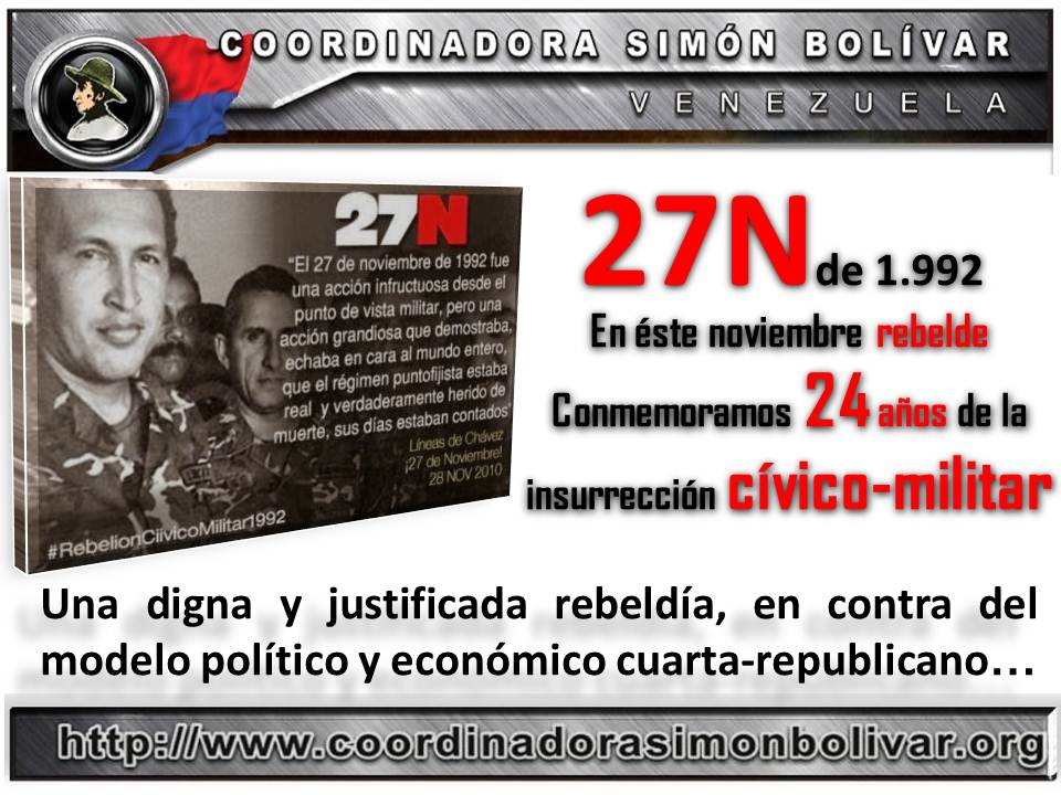 El 27 de Noviembre de 1992 representa la ruptura del viejo paradigma, en el cual las Fuerzas Armadas estaban destinadas a reprimir el movimiento popular insurgente en Venezuela. Con la muestra dada por el pueblo el 27 de Febrero de 1989 y la confianza ganada por los acontecimientos del 4 de Febrero de 1992, la unión cívico-militar llegó tener un rol preponderante en el consecuente derrumbe de la dictadura acordada en el Pacto de "Punto Fijo", principalmente por los partidos político Acción Democrática y COPEI, y tutelada por los Estados Unidos.