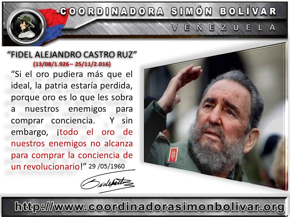 LA COORDINADORA SIMÓN BOLÍVAR como organización social de base, que sienta sus bases en ideales bolivarianos, rinde homenaje a quien dedicó toda su vida en beneficio de los nuestros, a quien con sus acciones despertó la conciencia de los pueblos subyugados por la alienación proveniente del norte. Con orgullo reflexionamos al compás de los cientos de miles de cubanos que aún despiden el cuerpo físico de aquel gigante, el Comandante inmortal de la Revolución, "FIDEL ALEJANDRO CASTRO RUZ", y a quien siembran en sus corazones dándole continuidad a su legado de justicia y paz en libertad.