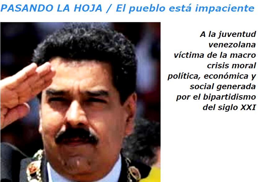 Le escribo con profunda indignación por el lamentable estado de penurias y sufrimientos de nuestro pueblo, sometido a la peor crisis moral, política, económica y social, desde los tiempos de la Guerra Federal, entre los años 1859 y 1863. Ocurre durante su mandato presidencial, producto de sus errores político-administrativos, desconocimiento del derecho y los parámetros de la función pública, e incapacidad manifiesta para revertir la corrupción mafiosa y el abuso de poder estructurados durante el gobierno de su predecesor Hugo Chávez Frías, quien faltó gravemente al compromiso contraído por el Polo Patriótico en 1998, para la recuperación moral de la República, ya hundida en proceso lamentable de degradación durante las décadas de los años 70, 80 y 90 de la pasada centuria por los factores políticos, económicos y comunicacionales del bipartidismo del siglo XX.