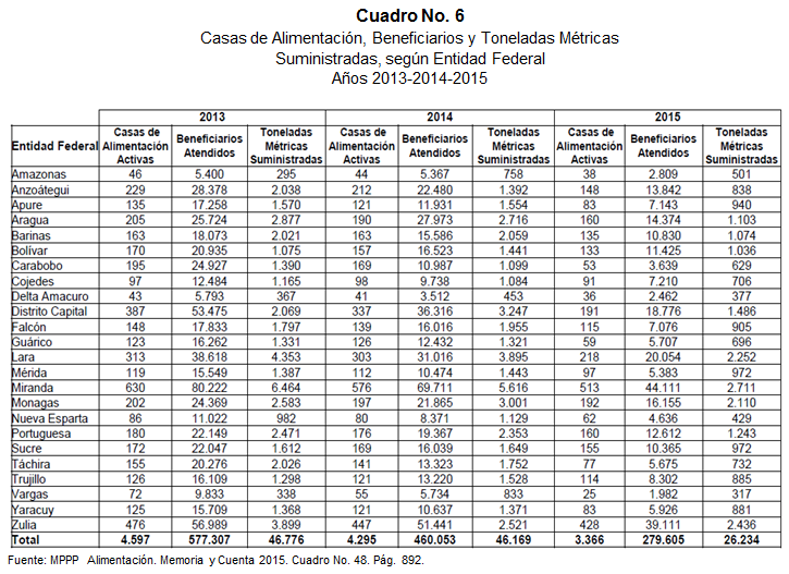 En números esto ha significado, según cifras oficiales del Ministerio de Alimentación en su memoria y cuenta 2015 que se ha pasado de 46.776 toneladas métricas de alimentos suministrados a través de las casa de alimentación en el 2013 a 26.234 toneladas, sin cifras oficiales del 2016. Esto se traduce en una disminución de beneficiarios de 577.307 en el 2013 a 279.506 en el 2015, y por la declaración previamente citada es un hecho que en 2016 esto pudo reducirse a la mitad o menos de la cifra del 2015.