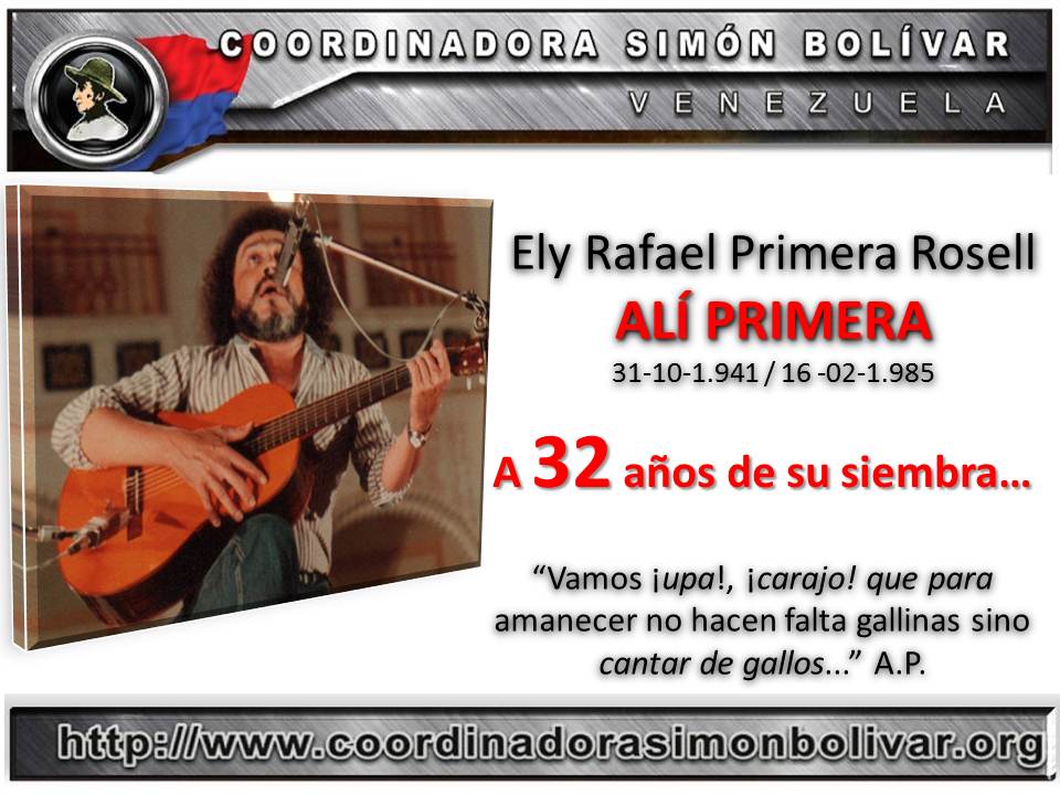 Ely Rafael Primera Rosell, mejor conocido como nuestro Alí Primera (Coro, Falcón, 31 de octubre de 1941 - Caracas, 16 de febrero de 1985) fue un músico, compositor, poeta y activista político venezolano. Sin dudas, es uno de los principales compositores y cantantes populares, de Venezuela y de Latinoamérica.