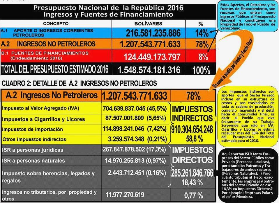 Es importante precisar que el Régimen Tributario en Venezuela está diseñado para favorecer a los que más ganan en detrimento de los que sobreviven únicamente de su trabajo. En el cuadro anterior hay que destacar que son muchísimos trabajadores y empresas públicas que tributan en ISLR No Petrolero y que el SENIAT no lo refleja, es decir, se trata de datos que hay que develar para saber cuánto aportan las grandes empresas privadas (personas jurídicas) y los grandes mil millonarios (personas naturales) del país. Otro dos hechos importantes que atentan contra una recaudación tributaria muchísimo más alta: es la falta de iniciativa gubernamental para evitar el inmenso fraude, evasión y elusión fiscal existente en el país e, igualmente, la incorporación dentro del Régimen Tributario de una Ley que permita pechar las irracionales y exorbitantes cuentas privadas en dólares (y otras divisas) que un sector de "privilegiados" venezolanos tienen en el exterior: con estas fortunas, en su inmensa mayoría mal habidas, sería más que suficiente para honrar el compromiso del Bono de Alimentación y Medicinas, sin tocar el Presupuesto.