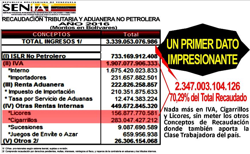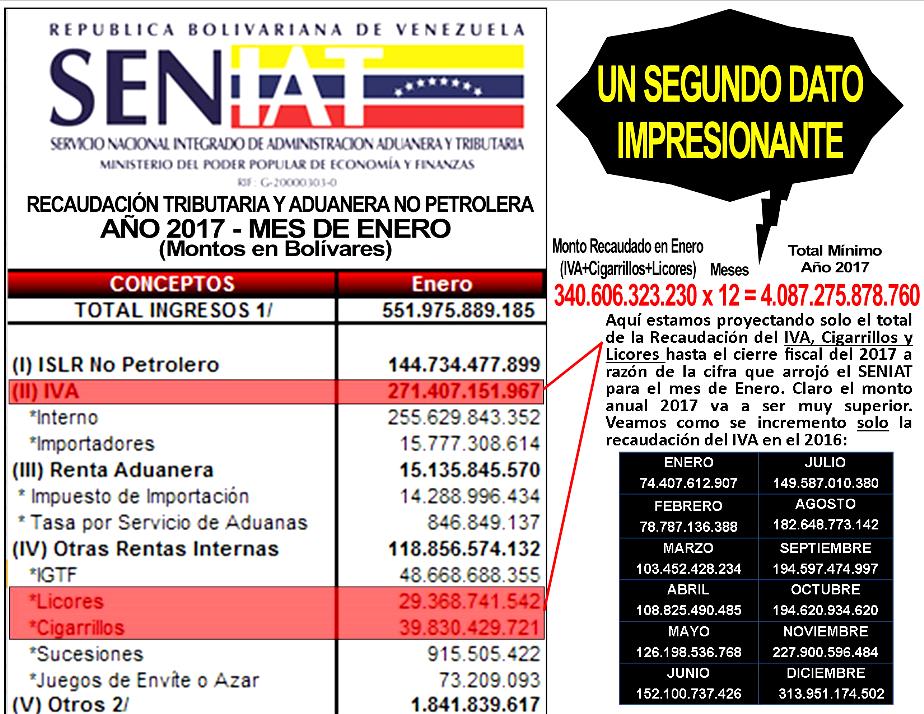 En el mes de septiembre de 2016, por encargo de los compañeros de Marea Socialista donde hago vida política, escribí un reportaje publicado en Aporrea[i] donde proyecté la Recaudación de los Ingresos No Petroleros para los últimos cuatro meses del año pasado, específicamente, IVA, Cigarrillos y Licores: cifras que indicaban records de recaudación de acuerdo a lo que arrojaban los datos que venía publicando en su página el SENIAT[ii]. La intención de ese reportaje era demostrar que existían los recursos financieros para empezar a pagar el Bono de Alimentación y Medicinas[iii], aprobado por Unanimidad en la Asamblea Nacional, incluso, desde el propio mes de septiembre en adelante y sin problemas para al Año Fiscal 2017 debido a la cifra de 8 Billones y medio, anunciada por el gobierno para el Presupuesto Estimado Nacional 2017.