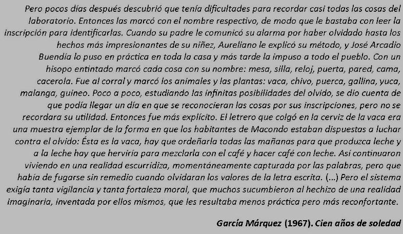 Solo quiero repasar cosas básicas de la formación de todo abogado, no para tratar de entender lógica y técnicamente lo que está sucediendo, sino para recordar cómo deben hacerse las cosas, para no acostumbrarme a la excepción permanente. Es un intento similar al que hicieron los Buendía en Cien años de soledad cuando fueron atacados por la enfermedad del insomnioque provocaba la amnesia colectiva. Necesito colocar etiquetas que me ayuden a recordar no solamente cuál es el nombre de las cosas, más importante aún, es tener en cuenta las funciones de las mismas, para no olvidarlas.