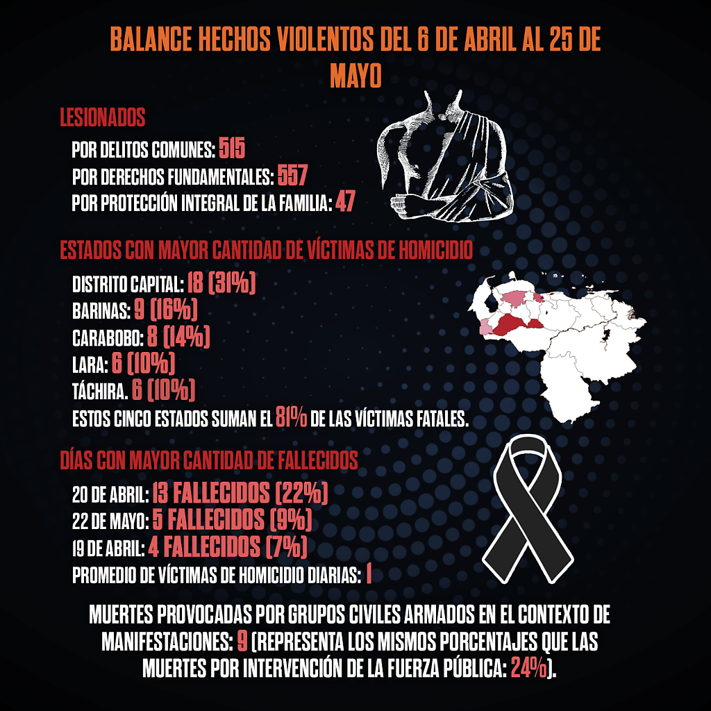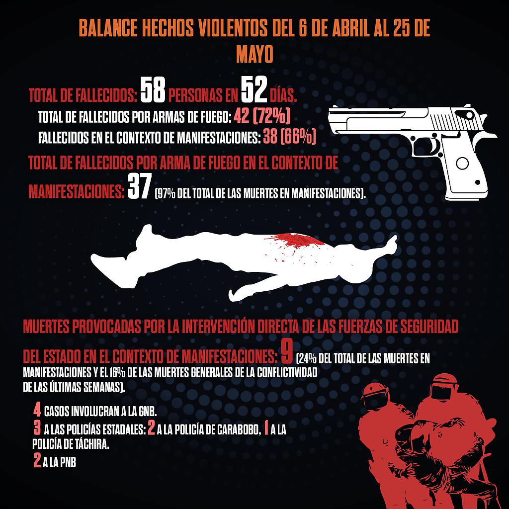 Las cifras son importantes para analizar y comprender los hechos que nos circundan. La crisis actual ha generado varios datos que resultan de interés y que el Ministerio Público ha publicado de manera oportuna en su página web. Con base en estos registros se puede hacer una primera caracterización de la violencia mortal, así como de las víctimas de la misma, vinculadas a la conflictividad callejera de las últimas semanas. Desde lo situacional puede afirmarse que es una violencia que ocurre en el espacio público y que tiene como principal instrumento las armas de fuego (72%), la mayoría ha ocurrido en el contexto de manifestaciones (66%). En al menos un 24% de estos casos hay responsabilidad de las fuerzas de seguridad del Estado, y en un porcentaje similar se puede evidenciar el ataque de grupos civiles irregulares que portan armas de fuego.