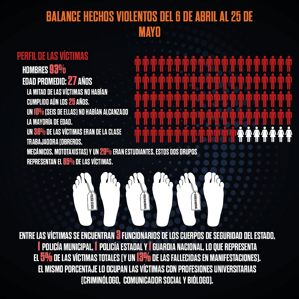 En cuanto al perfil de las víctimas el 93% son hombres, su edad promedio es de unos 27 años. El 36% pertenece a la clase trabajadora y un 29% son estudiantes, estos dos sectores constituyen el perfil mayoritario de las víctimas (65%).