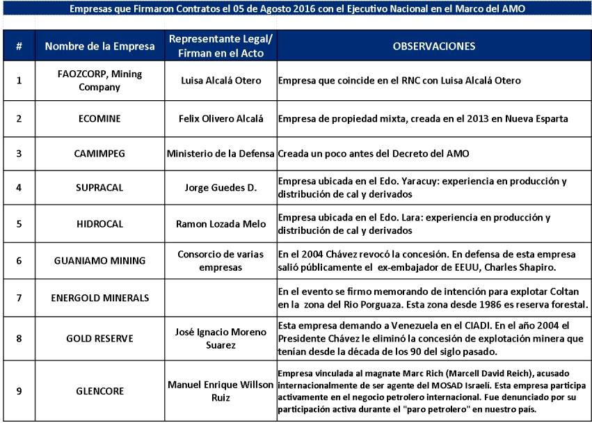 El 05 de agosto del año pasado, el Gobierno Nacional, en un acto público realizado en el Banco Central de Venezuela, firmó contratos con las empresas encargadas de explotar los recursos naturales que contempla el AMO. Veamos en el siguiente cuadro[2] de qué y de quiénes se trata el asunto.