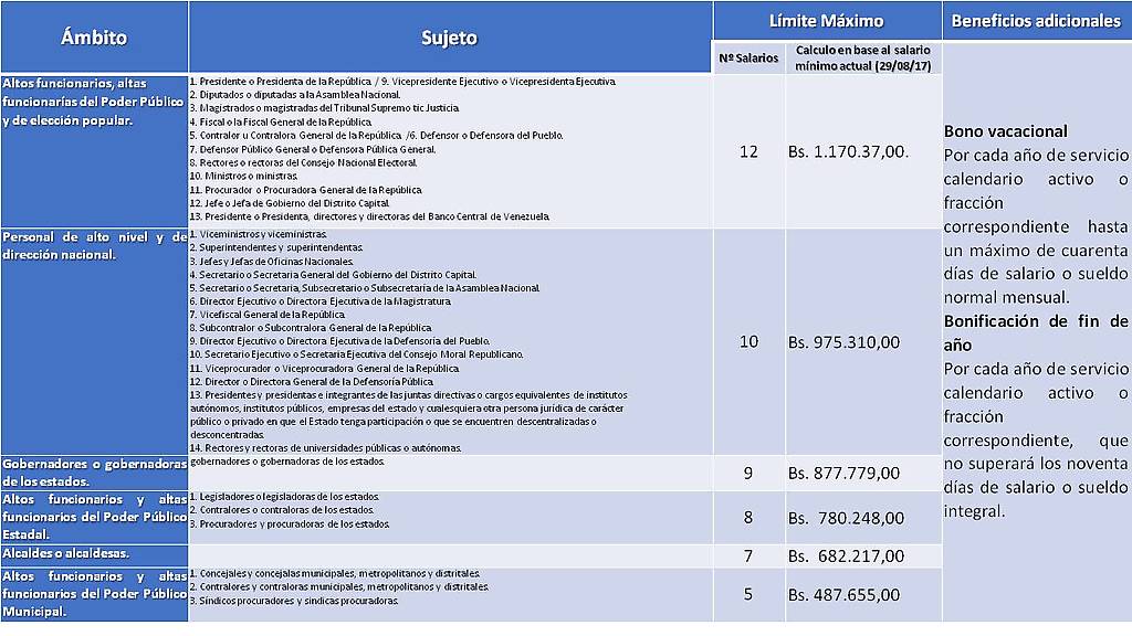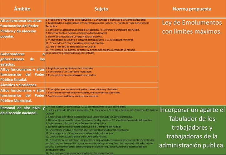 En concreto la propuesta puede estar orientada a que la Ley que rija materia fije exclusivamente los límites máximos de los ingresos de todas aquellas personas que hayan sido elegidos mediante comicios o designados por órganos colegiados. Y que por otro lado todas aquellas personas designadas por quienes hayan sido elegidos mediante comicios o designados por órganos colegiados se rijan por el tabulador de los trabajadores y las trabajadoras de la administración pública en un aparte que se incorpore para tal fin.
