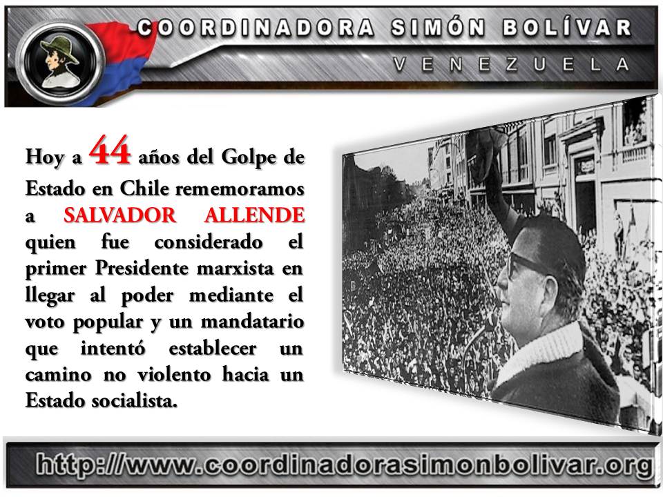 Hoy a cuarenta y cuatro (44) años del Golpe de Estado en Chile rememoramos a Salvador Allende quien fue considerado el primer presidente marxista en llegar al poder mediante el voto popular y un mandatario que intentó establecer un camino no violento hacia un Estado socialista.