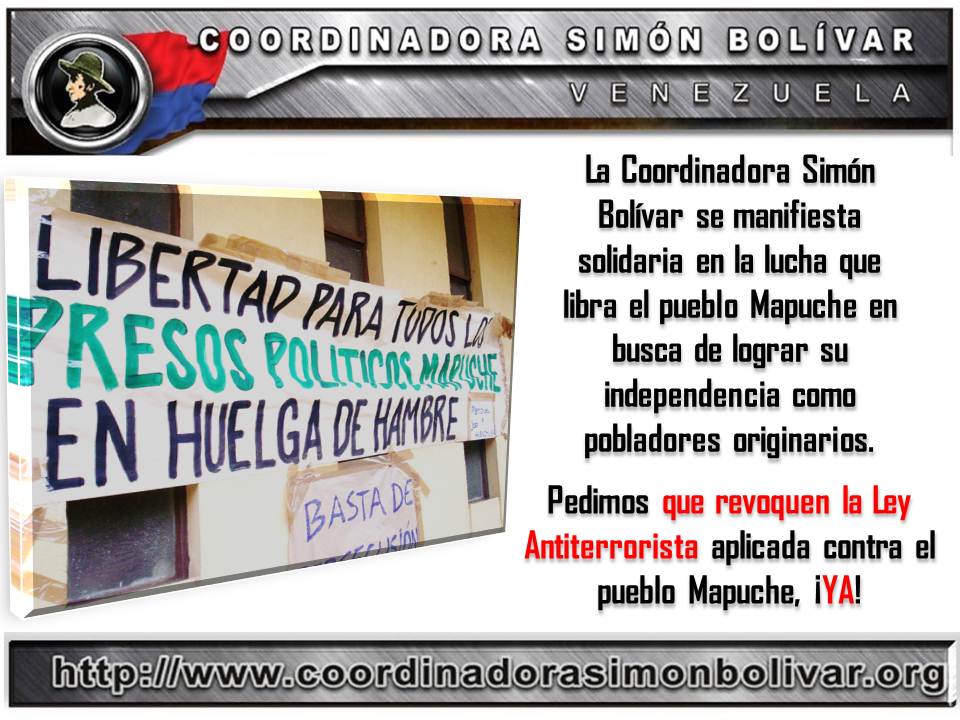 La Coordinadora Simón Bolívar se manifiesta solidaria en la lucha que libra el pueblo Mapuche en busca de lograr su independencia como pobladores originarios, y exige respuestas inmediatas a las autoridades competentes para que sus peticiones sean solventadas, ello en consideración a que la acción emprendida por algunos pobladores desesperanzados por los atropellos y la indolencia con la que han sido tratados sus requerimientos, ya les causa estragos físicos y están claramente expuestas sus condiciones de salud, a partir de la huelga de hambre emprendida.