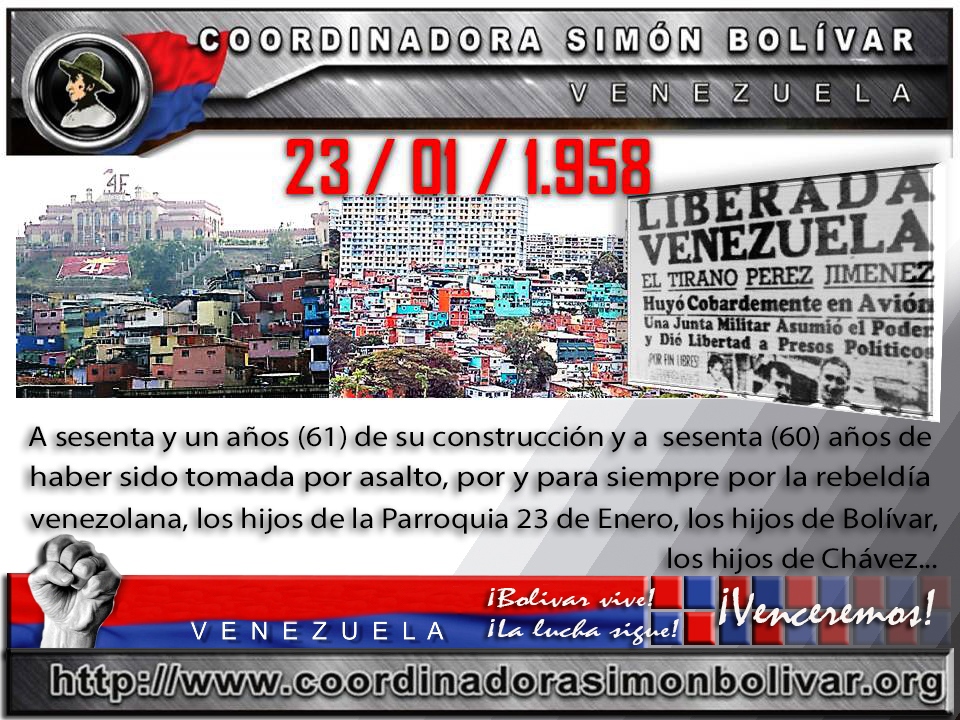 Éste 23 de enero, a sesenta y un años (61) de su construcción y a sesenta (60) años de haber sido tomada por asalto por y para siembre por la rebeldía venezolana, los hijos de la Parroquia 23 de Enero, los hijos de Bolívar, los hijos de Chávez, juramos vencer, porque somos revolucionarios, combativos, rebeldes, contestatarios, y críticos defensores de nuestro proceso socialista – bolivariano, y como siempre nos mantenemos trabajando…