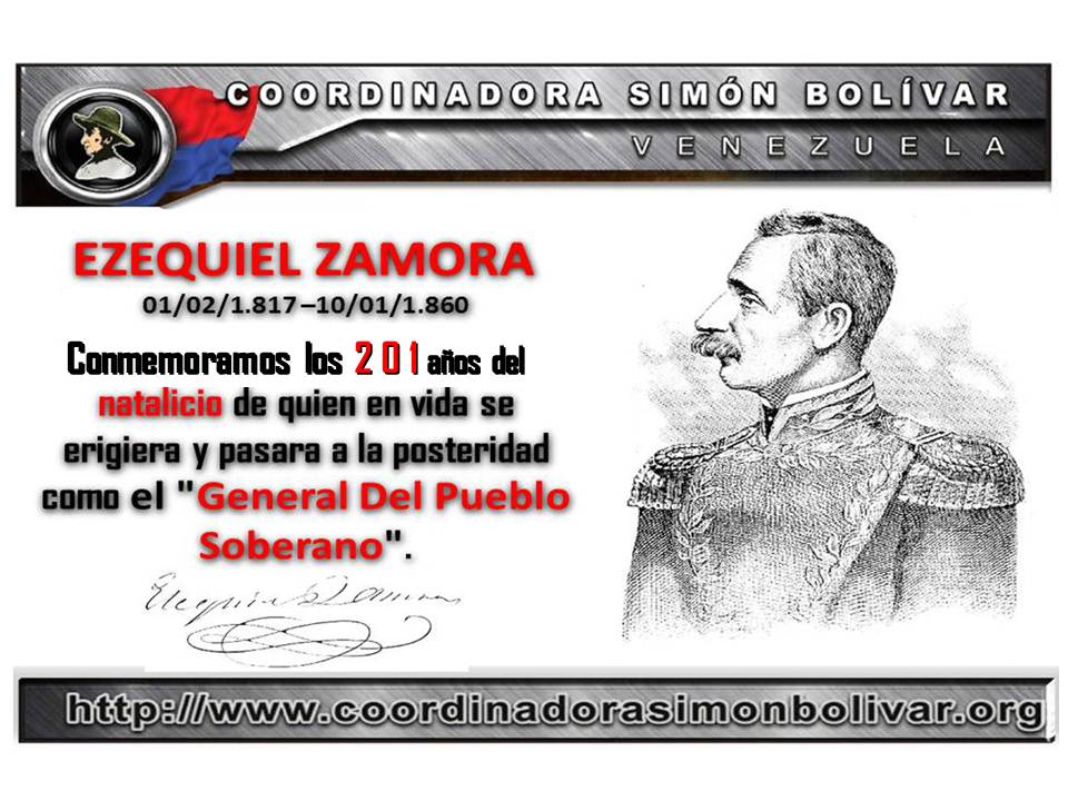 "¡Tierra y hombres libres!" Fue el llamado que hizo un nacido el primero de febrero del año 1.817, en la locación de Cúa, Estado Miranda, en Venezuela y que llevaba por nombre EZEQUIEL ZAMORA, a quien luego de su hazaña de recuperar, a riesgo de la propia vida, los derechos sin los cuales las personas veían su existencia reducida a la esclavitud y la indigencia, lo inscribió en la historia como el "GENERAL DEL PUEBLO SOBERANO".