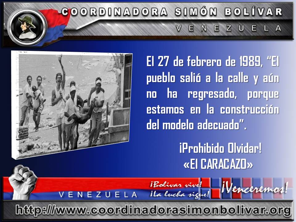 "El Caracazo", es el fiel ejemplo del pueblo que siguiendo la herencia insurgente de Bolívar, decidió salir a las calles contra las medidas neoliberales y miles de venezolanos(as) fueron masacrados para acallar la voz del pueblo soberano, con la muerte. Con el despertar del movimiento militar bolivariano y el Comandante Chávez, se inicia la llegada de la revolución bolivariana para dignificar al pueblo.