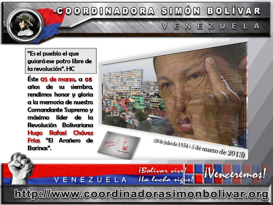 El 5 de marzo de 2013 nuestro Comandante Supremo y máximo líder de la Revolución Bolivariana Hugo Rafael Chávez Frías, pasó al plano de la inmortalidad y dejó sembrado en cada uno de los compatriotas venezolanos, su legado de brindar amor al desposeído y ayuda a los más necesitados. Con él libramos grandes luchas para lograr la conquista de nuestra soberanía y libertad, y así tener patria.