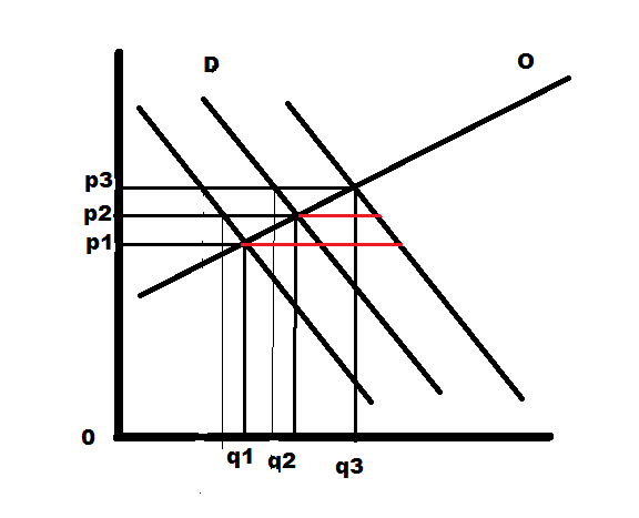 Hemos añadido en rojo una prolongación de los precios p2 y p3 ilustrativos de los excedentes de demanda sobre la oferta de mercancías.