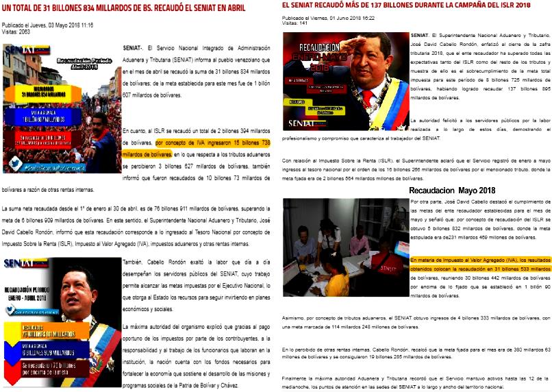 Estas son las notas de prensa publicadas en la página del Seniat donde se anuncian la cifras de Recaudación de Abril y Mayo[i]. Ver IVA: