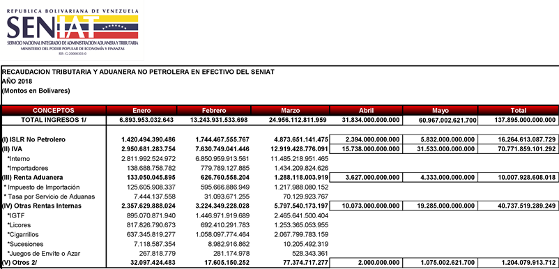 Esta es la Recaudación publicada por el SENIAT de Enero a Mayo. Ver IVA: