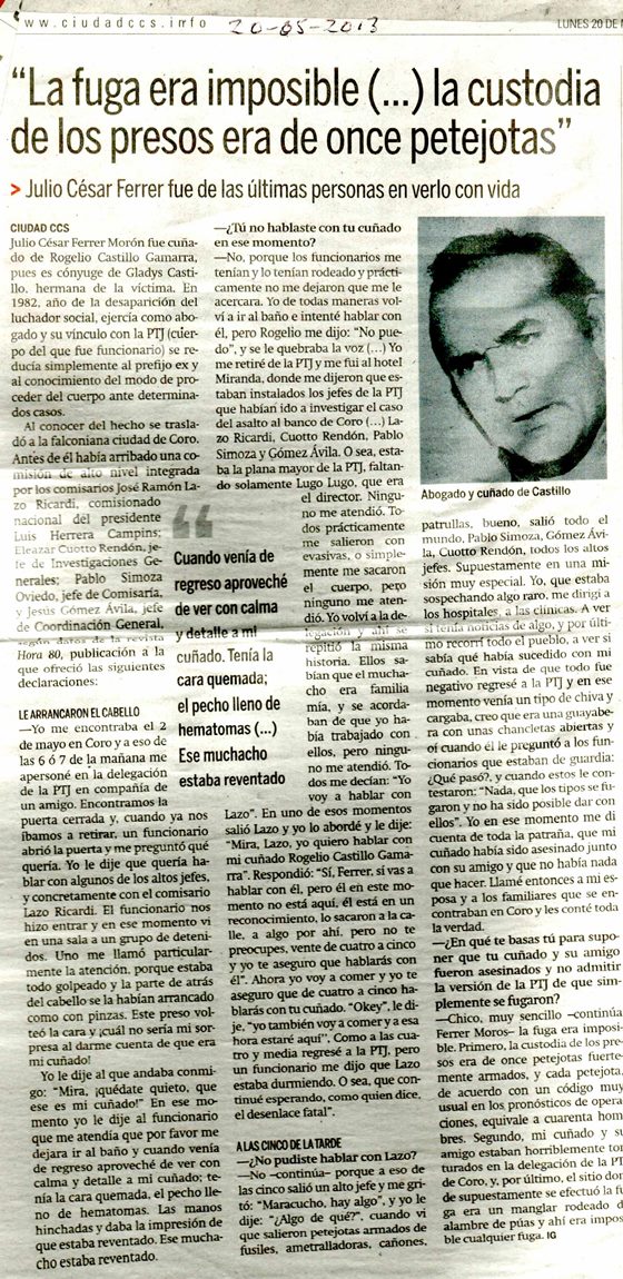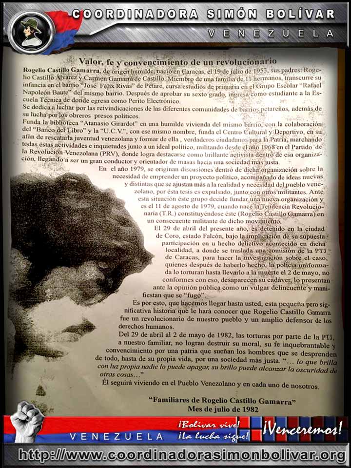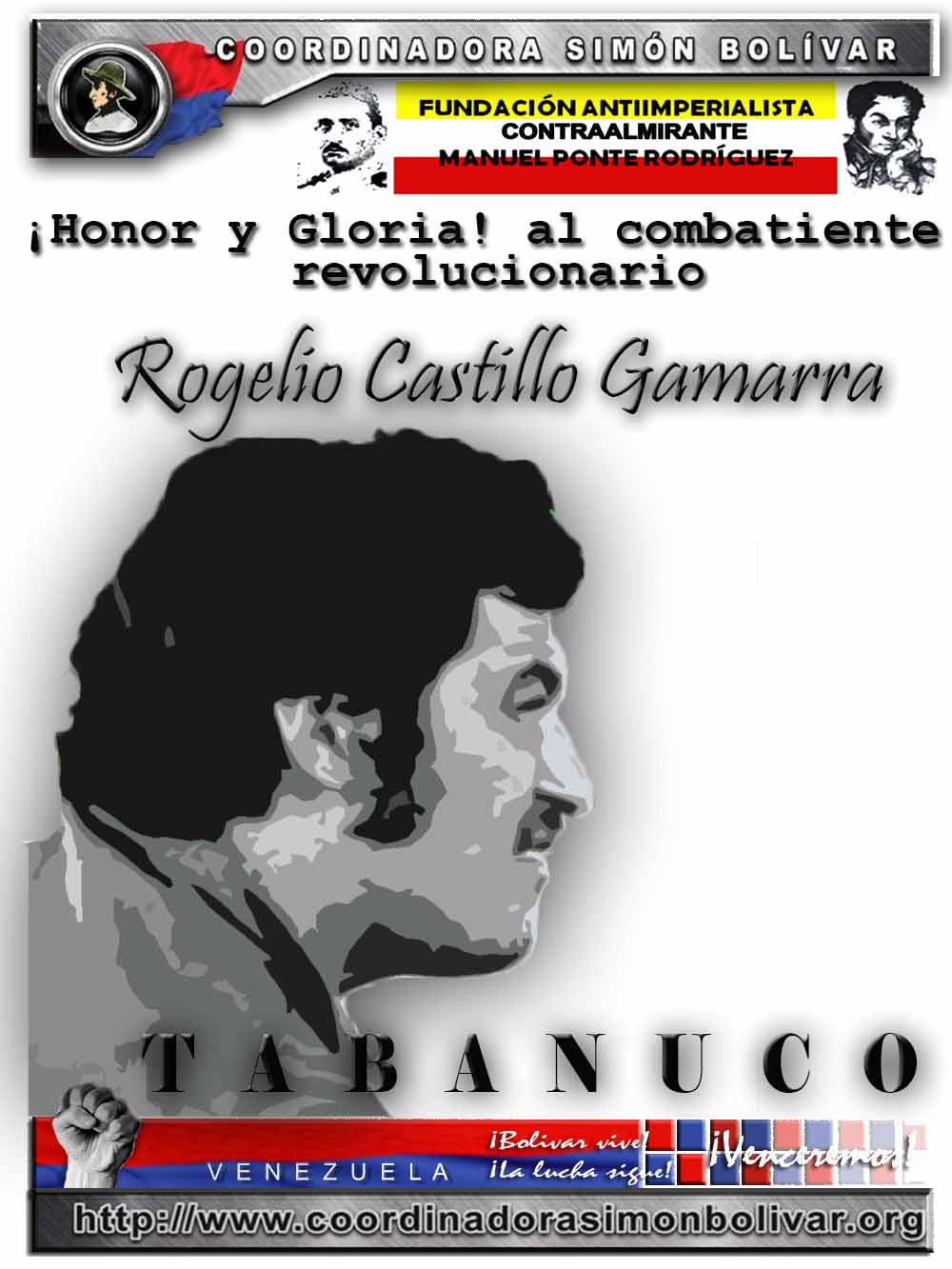 Rogelio Castillo Gamarra (Tabanuco), es detenido a la edad de 28 años por la PTJ el 29 de abril de 1982 en la ciudad de Coro. Víctima horribles torturas que le ocasionaron la muerte, su cuerpo nunca fue entregado a sus familiares, pasando a engrosar junto a muchos otros venezolanos la larga lista de los revolucionarios y líderes del pueblo a quienes se le aplicó la terrible práctica de la Desaparición Forzada, diseñada, instruida y enseñada en la Escuela de las Américas, nefasta escuela de las fuerzas militares norteamericanas donde estudiaron los más conocidos asesinos latinoamericanos como Pinochet, Videla, López Cisco y otros, para luego ser aplicada por los gobiernos terroristas de Estado de AD y COPEI ensangrentando nuestra Patria.
