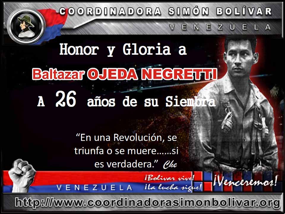 Hoy siete (07) de Septiembre de 2018, se cumplen veintiséis (26) años de la caída en combate por una Patria Buena, de la cual nos hablaba "el Panita" Alí Primera; el camarada y combatiente revolucionario Baltazar Ojeda Negretti, mejor conocido por los apodos de: "Ramón", "Balta" o "Comandante Elías".