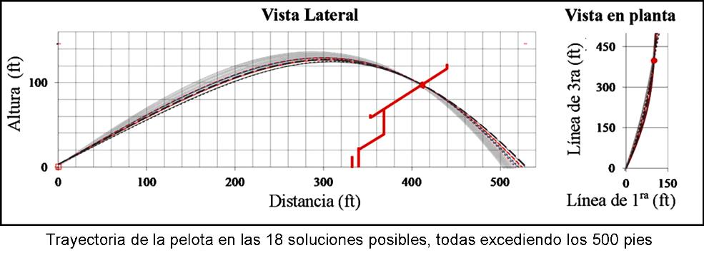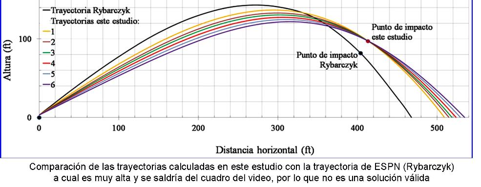 La distancia total de 468 pies encontrada por ESPN (2014) es menor que la encontrada en este estudio, principalmente porque utilizaron un punto de impacto en la fila 20 que es 15 pies más bajo y 9 pies más cerca del plato que las distancias obtenidas con la tecnología LIDAR que se considera más confiable por su alta precisión y porque corresponde al estadio construido. Se demuestra además que el punto más alto de la trayectoria de la pelota de ESPN (Rybarczyk) se sale del video por lo que se concluye que esa no es la solución correcta. Al contrario, la altura máxima según la solución encontrada en este trabajo se mantiene dentro del video, como debe ser, puesto que el camarógrafo nunca perdió de vista la pelota durante su recorrido.