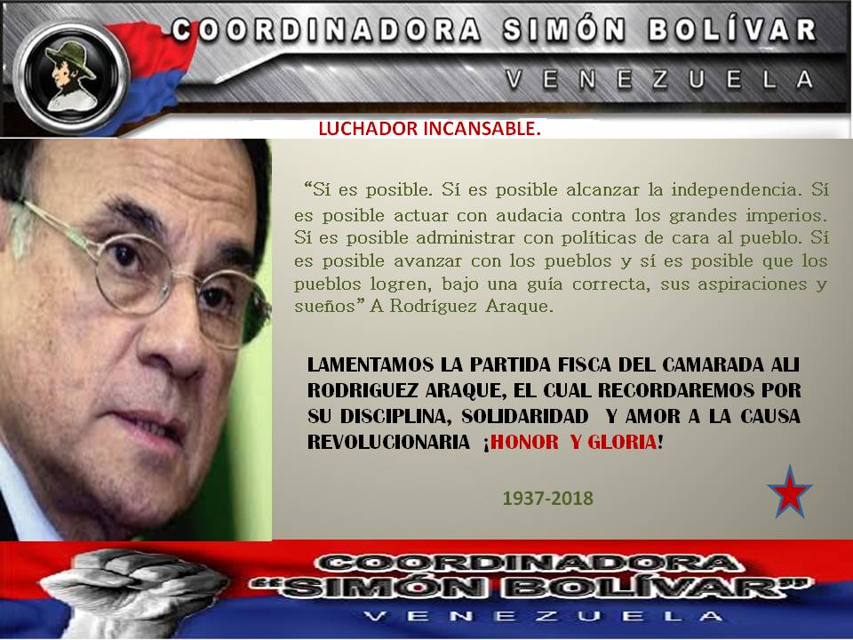 La Coordinadora Simón Bolívar expresa su mas profundo pesar por la partida física del camarada, hermano y amigo Alí Rodriguez Araque, Cmte. " Fausto " .