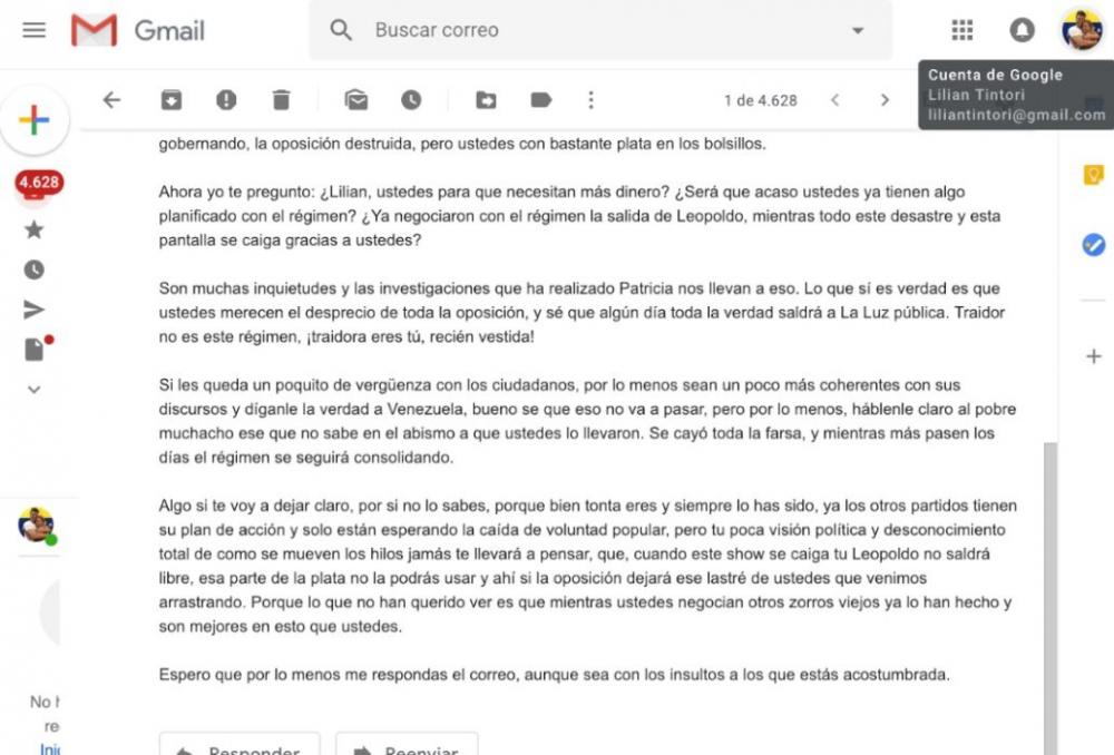Hace pocos días se filtró lo que presuntamente es un correo de una feroz opositora, increpa a la esposa del dueño de la franquicia Voluntad Popular, por lanzar a un desconocido como el diputado de segunda a esa aventura que no los va a llevar a ninguna parte y esta afirmó que haber colocado a este al frente es un suicidio político para la oposición venezolana.