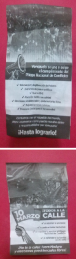 "10 de marzo todos A LA CALLE. A retomar la protesta. A unificar todas las Luchas. A respaldar y aprobar el Pliego Nacional de Conflicto. A defender a tu familia y a tu país. No te la cales: fuera Maduro y elecciones Presidenciales libres".