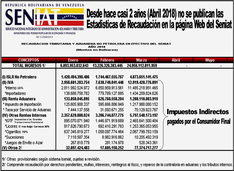Bueno, en medio de esta excepcional situación que vive el pueblo venezolano, transparentar las cifras de recaudación es un riesgo para el gobierno.  Demostrémoslo con esta grafica de la recaudación total del año pasado[ii] y la exorbitante cifra de los impuestos indirectos  que alcanza mas del 85% del total recaudado.