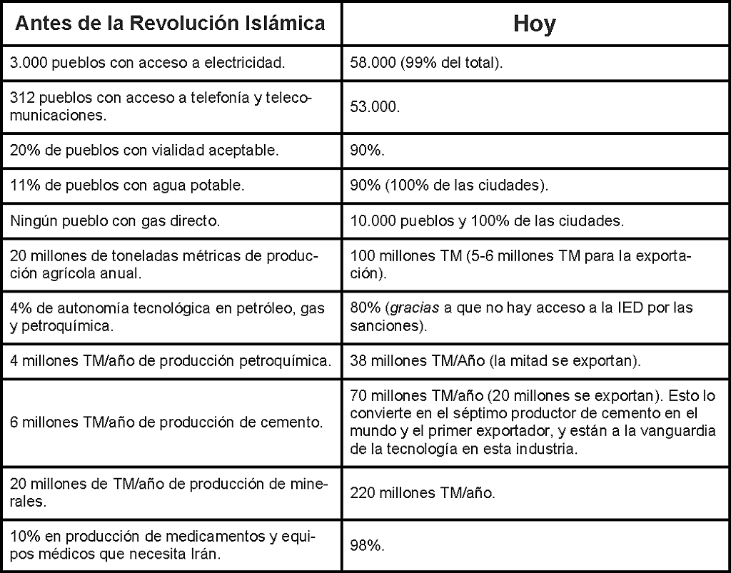Luego el embajador pasó a exponer algunas cifras comparativas de lo que era Irán antes de la Revolución Islámica y lo que es hoy día Irán, que presentaré en forma tabular para mejor visualización.