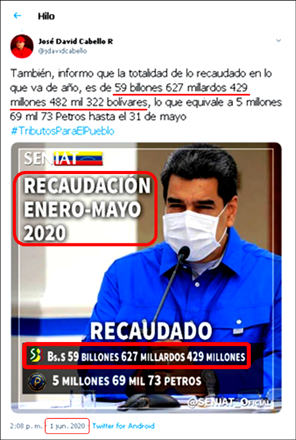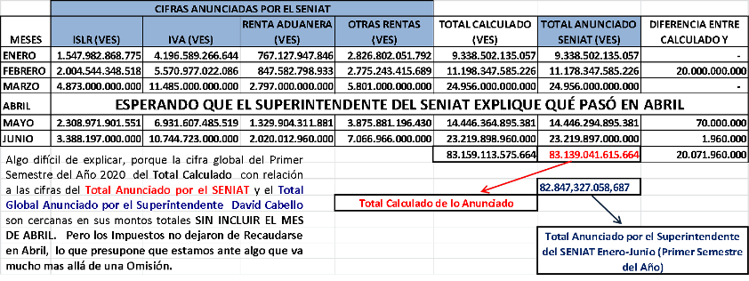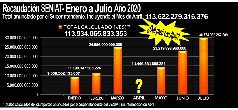 De aquí surge el Dato Clave, debido a que las tres cifras de los Totales de Enero a Mayo son muy cercanas y ninguna incluye el Mes de Abril.  Abril se le perdió al SENIAT y al Superintendente, tienen que encontrarlo y explicar qué pasó con Abril y, simplemente, porque de acuerdo con el BCV en el mes de Abril hubo Inflación superior a la de Marzo, que debe reflejarse en la Recaudación de esos cinco primeros meses del año 2020. En Marzo se recaudaron casi 25 billones de Bs. ¿Cuánto se recaudó en Abril?