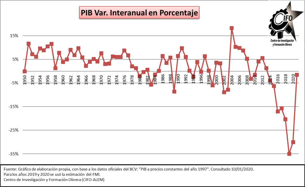 Según se aprecia en el gráfico, a partir de 2014 los precios del petróleo empiezan a caer ligeramente y la economía ya muestra síntomas de la destrucción rentística que sufrió en los años precedentes. De 2015 a 2018 la economía continúa la senda recesiva inaugurada en 2014, cada año con mayor ahínco. A finales del 2018 la economía ya había perdido alrededor del 50 % de su PIB, un retroceso histórico sin parangón, que situaba al país en la segunda peor crisis en la historia de América Latina, detrás de la crisis del sandinismo, en su primera versión. Entre el 2019 y 2020 se presenta una acentuación en las sanciones económicas contra el país, una crisis migratoria y el severo impacto de la pandemia del covid-19. Ello destroza por entero a la economía, y ya en 2021 se considera que la economía ha perdido alrededor del 80 % de su tamaño, en comparación con el año 2013. En el 2022 se estima que ha habido un ligero crecimiento de 5 %, según estimaciones optimistas.