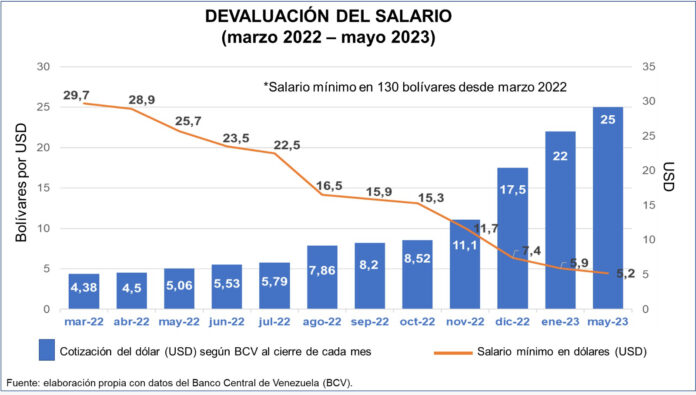 Al 2023, el salario mínimo de Venezuela de sólo 5 dólares al mes, es el más bajo de la región; incluso, inferior al de Haití (115 dólares mensuales) y al de Cuba (12 dólares mensuales). Estos 5 dólares al mes, significan 17 centavos de dólar por día, muy por debajo del umbral de la pobreza de 1,5 dólares diarios, establecido por las Naciones Unidas. Tal hecho, insólito y trágico, condena a más del 90% de nuestra población, es decir, a los trabajadores y asalariados, a la pobreza.