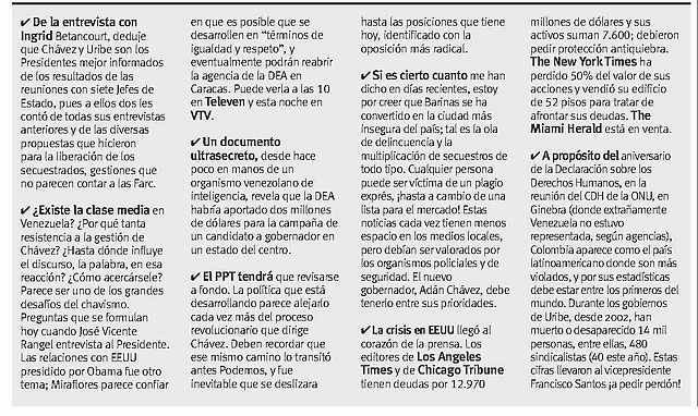 Algunas cuestiones planteadas: ¿cree posible diferir o suspender el referendo por la enmienda si el alto gobierno observa que puede ganar el No? ¿Piensa que tomarán medidas restrictivas contra alguna televisora? ¿No cree que es abusivo que el Presidente se adelante a decir que Manuel Rosales será condenado? ¿Cree que empieza a aparecer la frustración en muchos seguidores del Presidente? ¿Cómo se vislumbran las relaciones con Obama? ¿Soportará la crisis por la baja de los precios del petróleo?