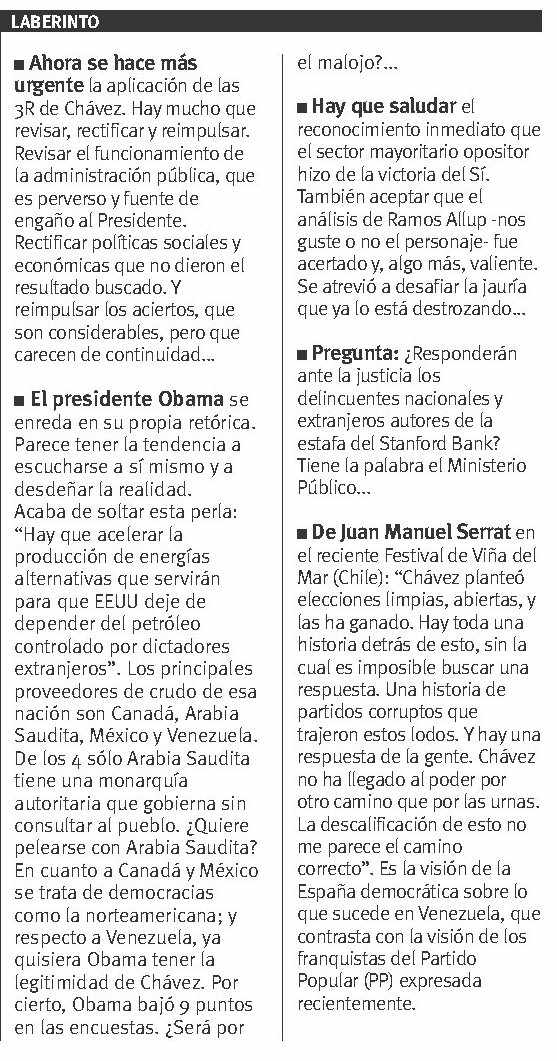 Aplicando la apreciación de Fidel a Chávez al resultado del 15F, hay que decir, responsablemente, que no hay en Venezuela cinco millones de oligarcas, y que algo no está marchando bien, de lo cual es reflejo lo electoral. Para ilustrar lo que ocurre está no sólo el análisis del voto adverso de la llamada clase media, altamente beneficiada con el actual gobierno. También, de acuerdo con lo que escribió Eleazar Díaz Rangel en su columna del 22/02/09, está el dato siguiente: "Significativa la cantidad de votos del No en sectores populares, de más bajos ingresos (IV-V o segmentos D-E): 3 millones 290 mil 661 que seguramente viven en los barrios pobres". Son venezolanos -agrego yo- favorecidos como nunca con las políticas oficiales. Por eso es que asumir a priori actitudes descalificadoras del logro electoral de la oposición el 15F, es una banalidad.