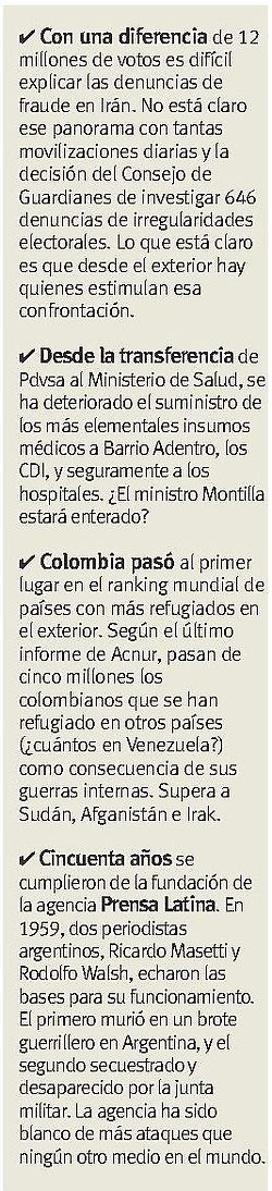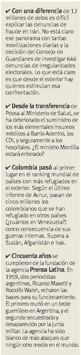 He escrito y repetido en intervenciones, que lo que ocurre en Venezuela desde hace poco menos de 10 años en la relación medios-Gobierno, se repite en la medida en que han sido electos gobiernos con características más o menos similares. Lo han denunciado Evo Morales y Rafael Correa de manera muy categórica, precisa y reiterada; está presente, con matices, en Argentina, y lo comentaba hace poco la presidenta Cristina Fernández, y con la Bachelet en Chile es implacable la campaña de El Mercurio y su prensa. Hasta en Honduras es posible encontrar los mismos rasgos en esa relación.