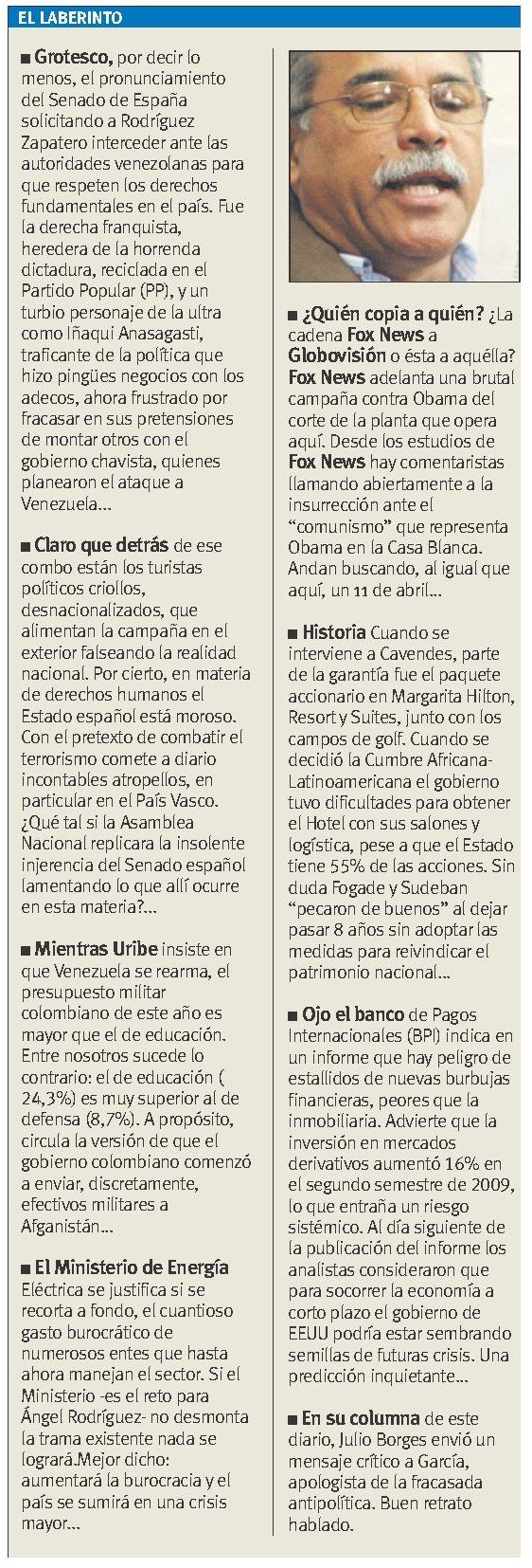 E s conveniente que en Venezuela exista una oposición responsable. La necesita el sector que enfrenta al presidente Chávez. La necesita el chavismo. Y lo más importante: la necesita el país. No descubro con esto que escribo el agua tibia: la Constitución Bolivariana consagra el pluralismo, es decir, la participación de los ciudadanos de cualquier tendencia política e ideológica en el marco del Estado de derecho. Lo prevé la propuesta de socialismo del Siglo XXI, concebido éste en libertad y democracia. A lo que hay que agregar que durante los 10 años de proceso bolivariano, la oposición ha fallado, no por culpa del gobierno de Chávez sino por la infinidad de errores en que ha incurrido. No hay contrapeso en Venezuela no por falta de garantías y de espacios, sino porque la oposición en su conjunto -salvo excepciones- tomó el atajo de la aventura extraconstitucional. A los partidos y grupos que se autodefinen como oposición se les plantea un nuevo desafío para el próximo año, con motivo de la elección de la Asamblea Nacional. En el pasado reciente incurrieron en la insólita actitud de abstenerse y ahora prometen no hacerlo. Ojalá que así sea para que Venezuela cuente con un Poder Legislativo donde participen variadas expresiones del espectro político. Pero lo confieso: tengo mis dudas.