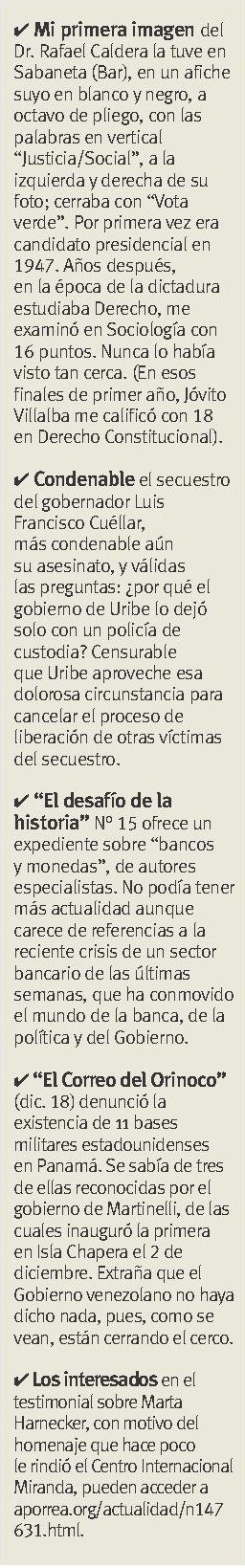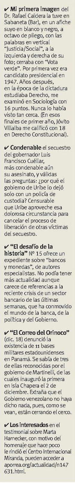 Manuel Cabieses editorializó así en "Punto Final", fechado el 24: "El gobierno de Uribe ha generado el más delicado problema que hoy enfrenta América Latina al firmar con EEUU un convenio que resigna la soberanía colombiana para permitir la instalación de siete bases militares norteamericanas. Si Piñera es elegido presidente, alineará a Chile junto a Colombia y otros países de la región que han arriado la bandera de la dignidad latinoamericana.
