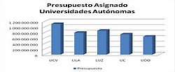 El Ministerio de Educación Universitaria le asigna a las cinco (5) Universidades Autónomas el 54.87% de su presupuesto anual. De estas universidades a la UCV históricamente siempre se le ha otorgado el mayor presupuesto de todas las universidades a nivel nacional y para este año 2010 la Universidad Central de Venezuela dispone del 15.8% del presupuesto total asignado al MEU, seguido de La Universidad del Zulia con el 12.35%, la Universidad de los Andes con un 11.33%, La Universidad de Carabobo con 10.45% y finalmente la Universidad de Oriente con un 9.29%.