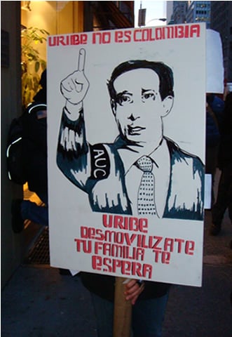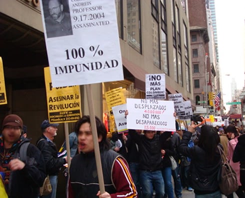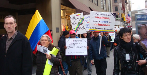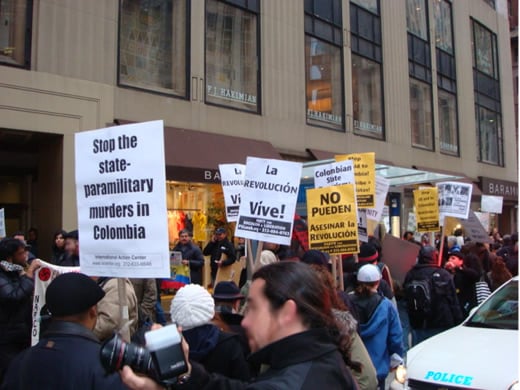 Nueva York, 7 de marzo de 2008.- Ayer se desarrollo una nutrida protesta frente al consulado de Colombia en Manhattan, que incluyo inmigrantes colombianos, ecuatorianos, dominicanos, puertorriquenos, asi como organizaciones de derechos humanos y sociales.